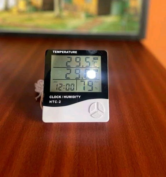 Device for measuring air temperature and humidity; displays data in °C/°F, helps track indoor/outdoor conditions for comfort and health. Multi-use in homes or offices. Sold in Apam, Ghana.
