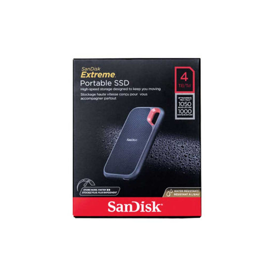 The SanDisk Extreme Portable SSD V2 4TB delivers high-performance with 1050 MB/s read and 1000 MB/s write speeds via USB 3.1/3.2 Gen 2 (Type-C/A). Bus-powered, includes USB-C to C cable and C to A adapter. IP55-rated for water/dust resistance and