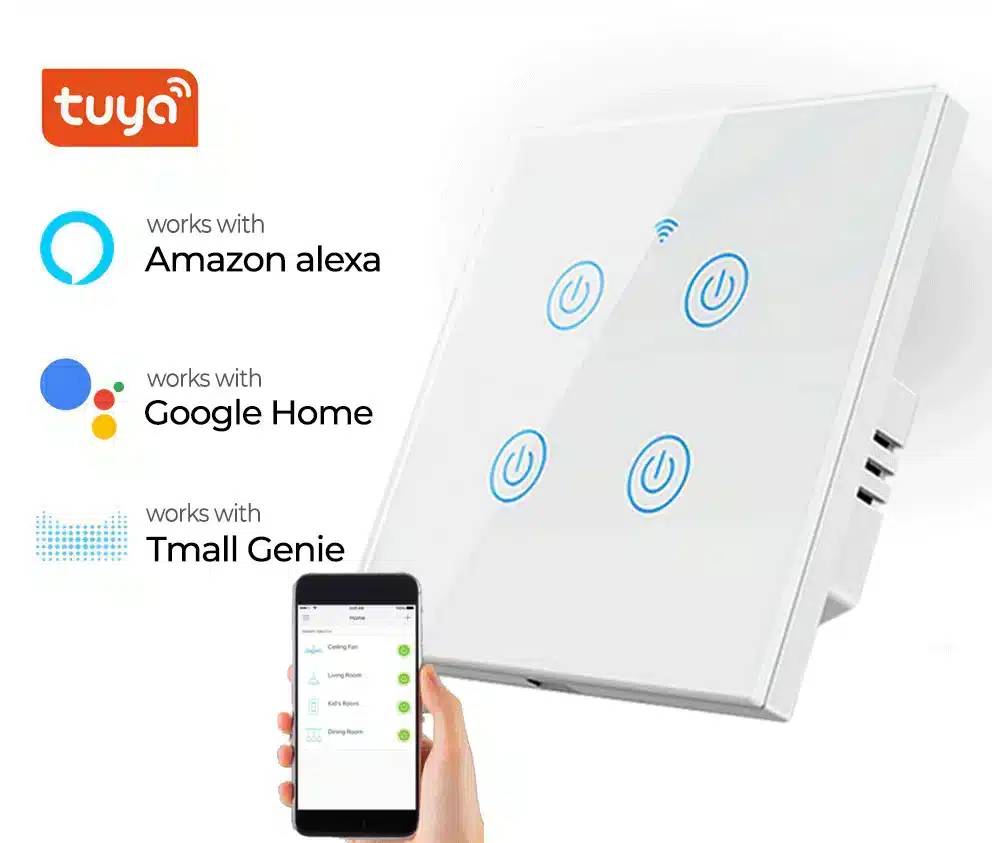 Upgrade your home lighting with the Smart Wi-Fi 4-Gang Light Switch, designed to control four separate circuits easily from your smartphone or via voice commands. Compatible with Amazon Alexa, Google Assistant, and the Smart Life