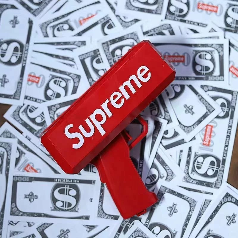 Party blaster: 500-note clip, 10m range. USB-C 1200mAh (4hr). Trigger fire, LED counter. ABS durable. Fake/real bills. Weddings, clubs, TikTok. Supreme logo. Gift box. 1-year warranty. Order in Accra.