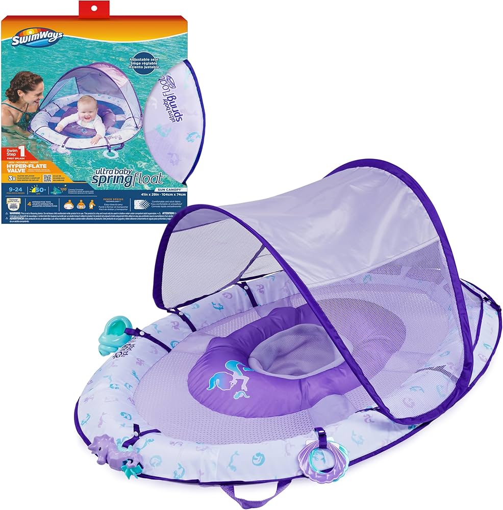 Make baby's first swim experiences safe and joyful with the SwimWays Ultra Baby Spring Float featuring an adorable shark design. This premium float combines innovative spring technology with a UPF 50+ sun canopy to create the ultimate water in