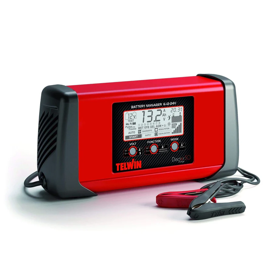 The Telwin Doctor Charge 50 is a professional-grade electronic battery manager designed for charging, testing, and maintaining all major battery types, including WET, GEL, AGM, MF, PbCa, EFB, and Lithium batteries. Compatible with 6V, 12V, and 24V