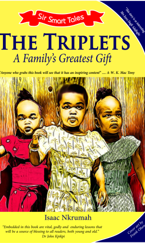 The Triplets is a 160-page children’s novel of Akuapem royal triplets separated at birth—reunite via 2020 DNA test, 30 palace intrigues, 20 Twi lullabies.