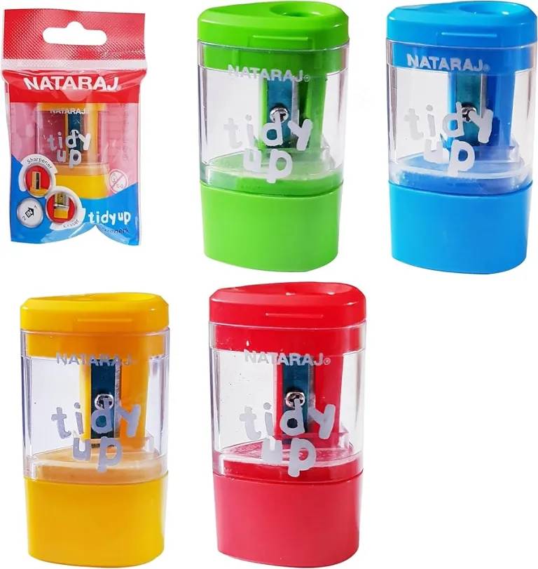 The Tidy Up Pencil Sharpener is a convenient 2-in-1 tool combining a single-hole pencil sharpener with a built-in eraser, all in a compact tub-style container. Designed to keep your workspace clean, it neatly collects shavings while offering quick