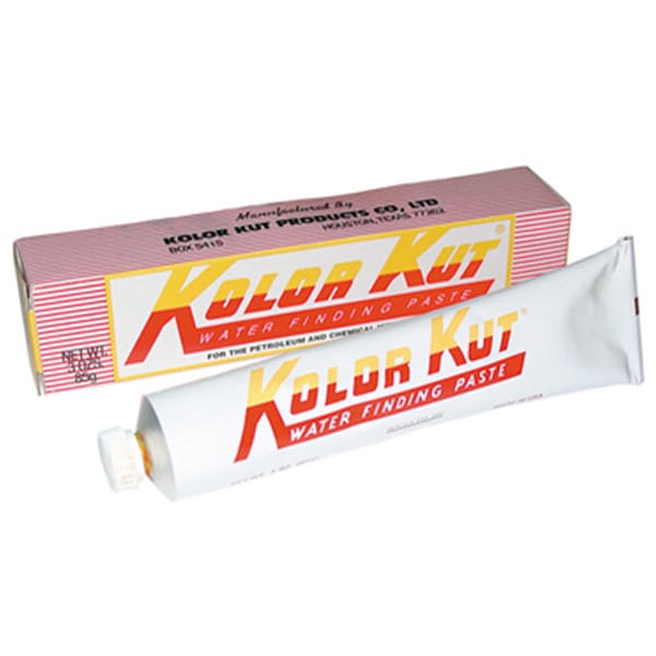 Kolor Kut Water Finding Paste provides a quick and reliable method for detecting the presence of water in petroleum products such as gasoline, kerosene, diesel, and heavy fuel oil. This golden brown paste instantly turns red upon contact with wate