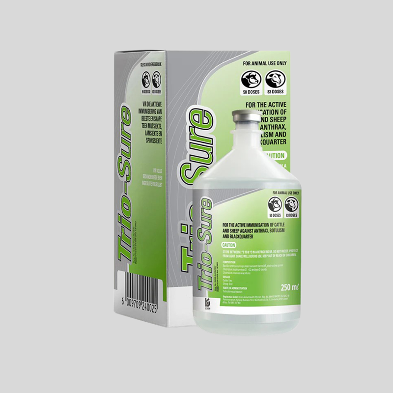 Trio-Sure 250ml is a broad-spectrum vaccine designed for the active immunization of cattle and sheep against anthrax, botulism, and blackquarter. By combining specific strains and toxoids, it provides comprehensive protection for your livestock. Recommended annual boosters maintain immunity and ensure continued protection against these critical diseases, supporting the health, productivity, and longevity of your animals.