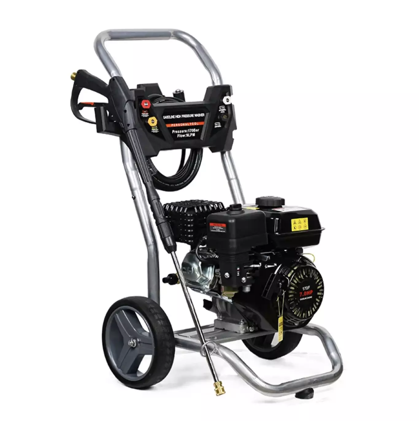 Unleash maximum mobility and power with this 7HP petrol-powered pressure washer. Generating 170 Bar of pressure, it is ideal for remote locations or areas without electricity, making it perfect for farms, construction sites, and large properties. The robust steel frame and heavy-duty wheels are built to handle tough environments, providing reliable cleaning power for vehicles, equipment, and concrete surfaces.