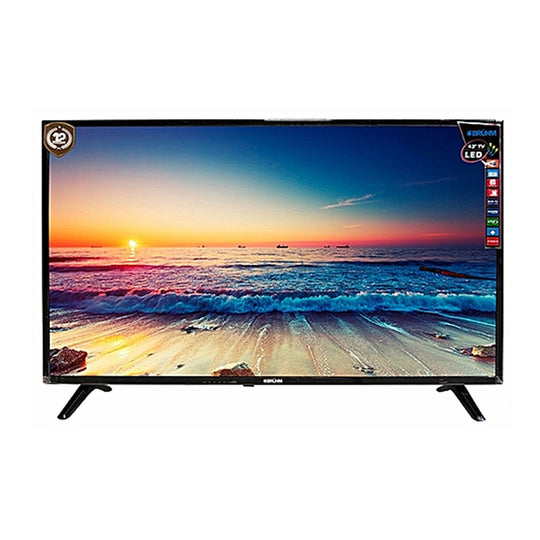 The Bruhm 43" HD Ready LED TV (1366x768) features high contrast, Dolby Digital audio, and multiple sound modes. HDMI, USB, VGA, AV in/out, satellite tuner, narrow frame. AC 220-240V—affordable, versatile entertainment display for movies, sports, and casual viewing.
