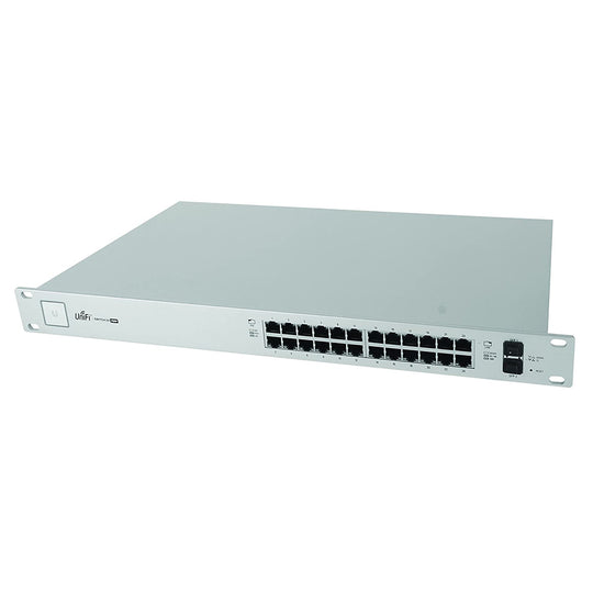 The rackmount USW-24-POE powers 24x GbE PoE+ (250W, 802.3af/at) + 2x 1G SFP with 52Gbps switching and fanless cooling. UniFi SDN, 802.1X, QoS—silent, scalable for APs/cameras in hotels, offices, or schools with 300+ clients.