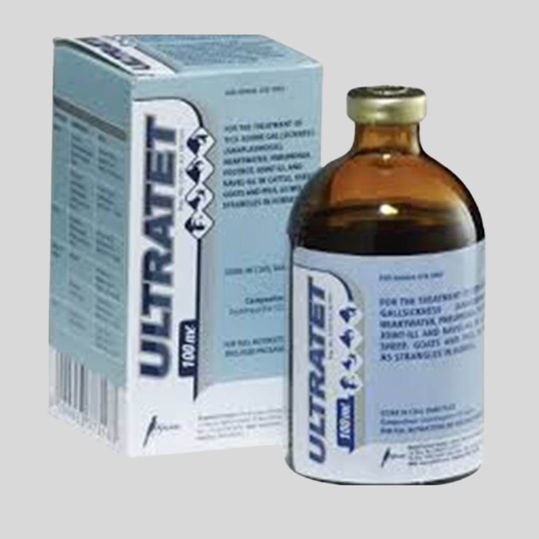 Ultratet 100ml is a broad-spectrum antibiotic containing Oxytetracycline 10%, formulated for the treatment of bacterial infections in cattle, sheep, goats, and pigs. It is effective against both Gram-positive and Gram-negative bacteria and is particularly useful for respiratory infections, wound infections, foot rot, mastitis, and enteritis.