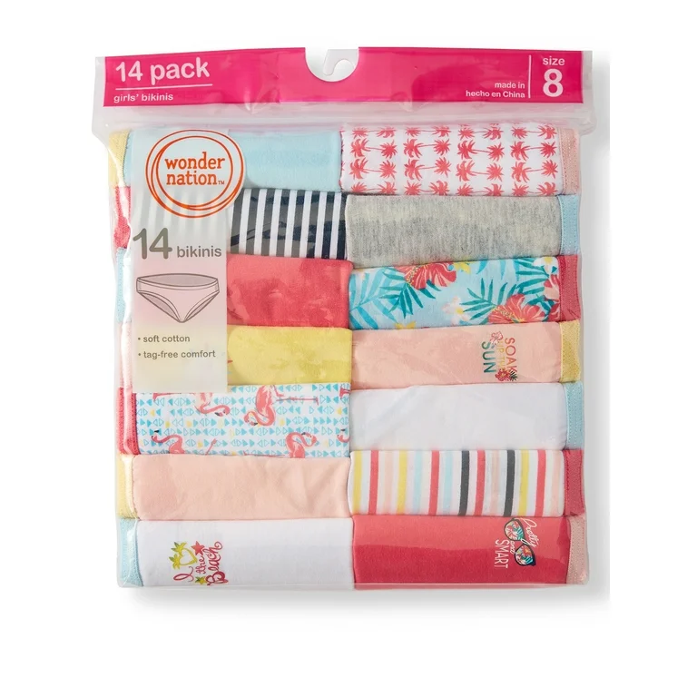 Keep your little girl comfortable and confident with the Wonder Nation Girls Bikinis 14-Pack. Crafted from 100% soft cotton, these bikini-style panties provide a breathable and gentle fit, perfect for everyday wear. A convenient pack with multiple