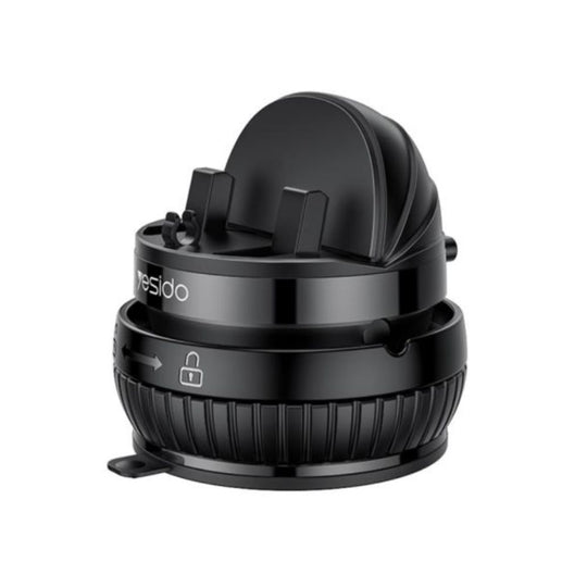 Adjustable car phone holder for phones 4.6 to 6.7 inches. Features suction cup base with twist-release mechanism and full 360-degree rotation for landscape or portrait viewing. Made of ABS and silicone materials for grip and durability.